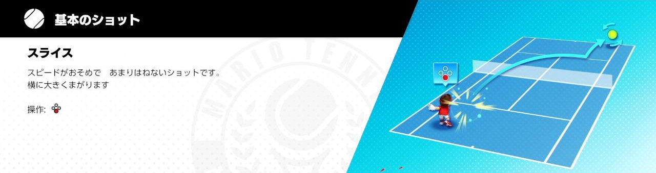 基本ショットその2 スライス 逆回転を掛けるバウンドが低く、遅いショット。高い位置から打てばスピードがかなり上がる! また、トリッキータイプのキャラは曲がるため、相手を惑わすことも可能。 #MarioTennisAces #NintendoSwitch pic.twitter.com/tKCaMUq7L4